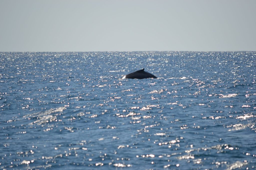 De walvissen spelen met onze voeten en net wanneer we aan de lunch willen beginnen, komen ze af en toe piepen. Maar net boven het wateroppervlak krult de staart in een boog om terug in de diepe oceaan te verdwijnen. Ondertussen zitten we verder buiten het rif en nemen de golven in hoogte toe. Schommelend over het water proberen we onze broodjes zonder te knoeien naar binnen te spelen.