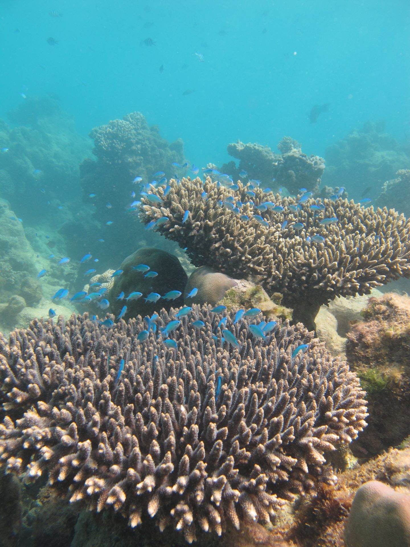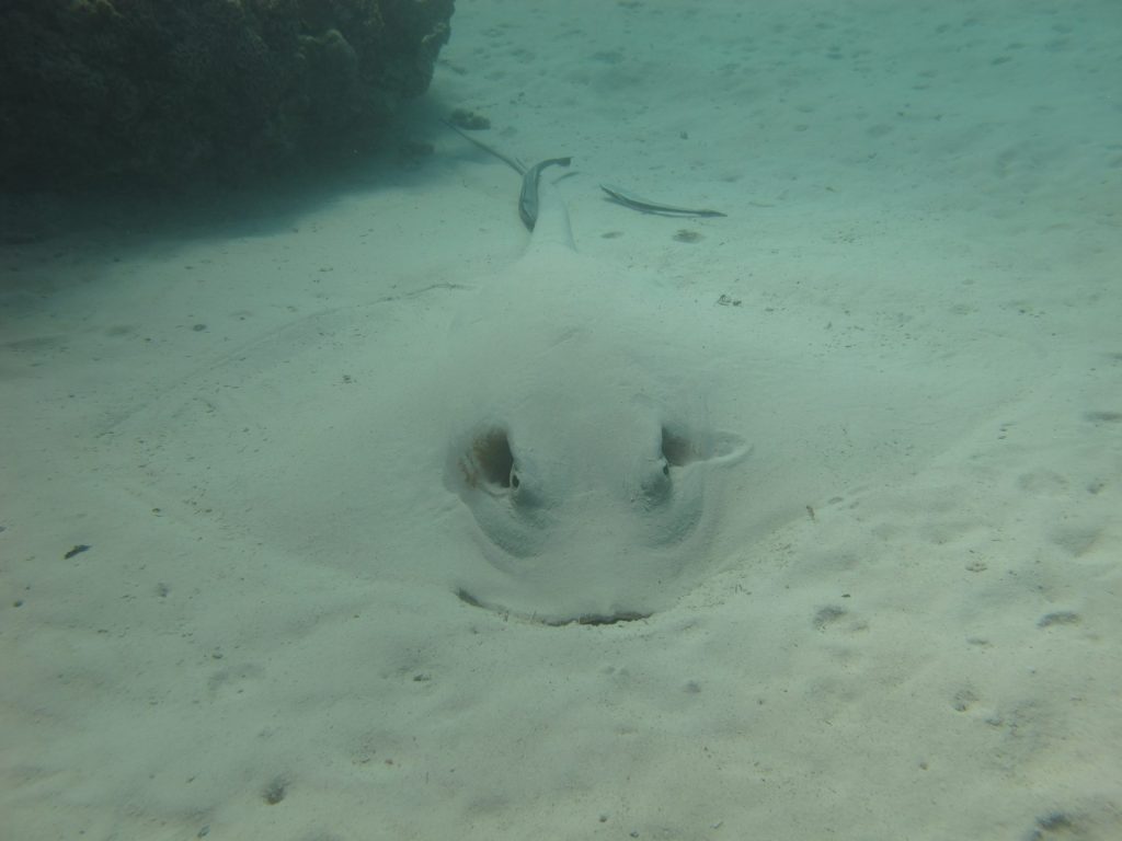 Ver hoeven we voor ons eerste snorkelsessie niet te varen, want we blijven in de lagoon. Jasper snorkelde, als enige van de groep, nooit eerder en proeft direct een aantal keer van het Australische zeewater. Flauwvallen zal hij vandaag niet doen. Pijlstaartroggen verstoppen zich onder een laagje zand, maar niemand is veilig voor Louises lens. Visjes in allerlei kleuren en maten zwemmen lustig in het rond. Helaas, ook hier verbleekte het koraal al grotendeels onder de felle zonnestralen.