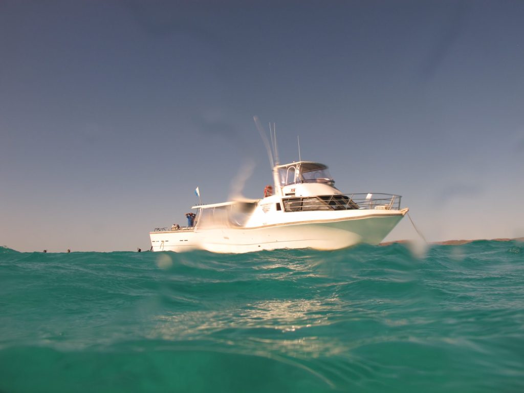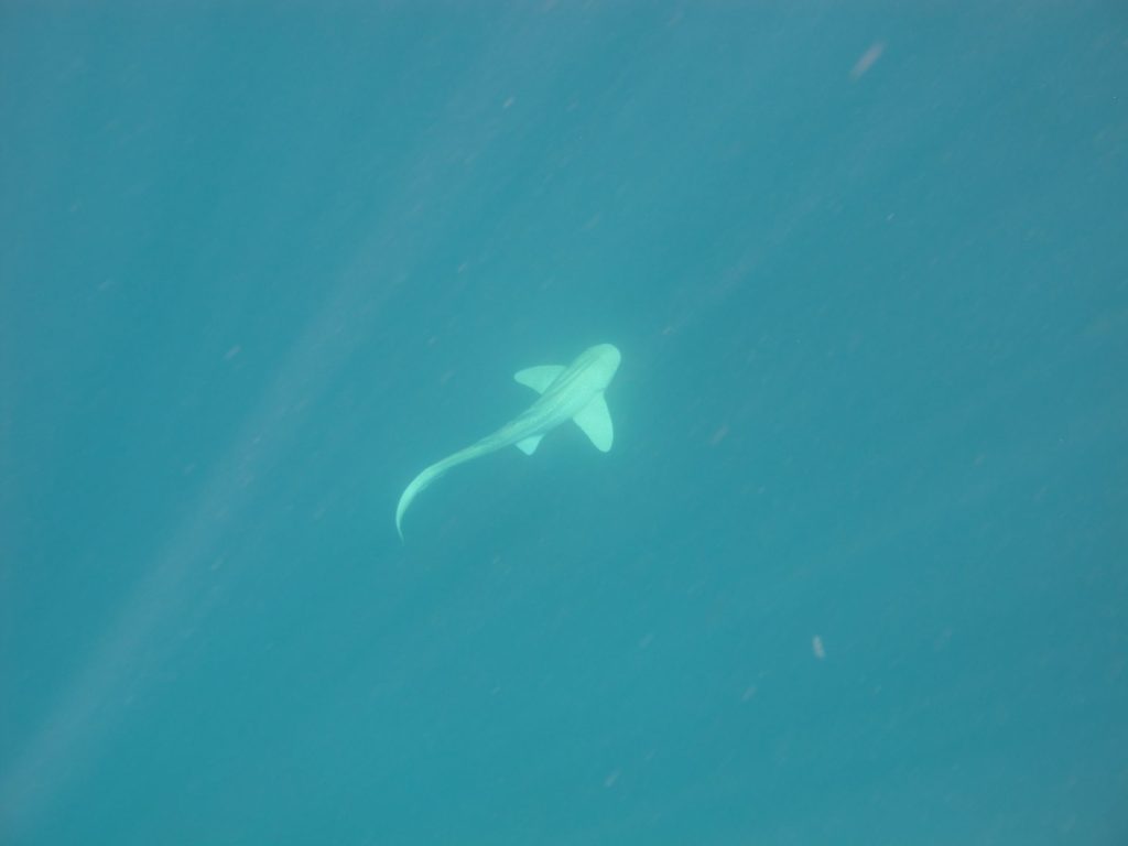 Springen mag niet, want dat schrikt het beest af, waarop hij er tegen 60 km/u uit zou muizen. Vol adrenaline volgen we Jess en Louise in de hoop een glimp van het dier op te vangen. Het is maar een klein exemplaar en is al snel nergens meer te bespeuren. De piloot heeft hem nog steeds in het oog dus klimmen we terug op de boot en wachten we buiten adem op het dek – wat is dit spannend! Jasper en ik duiken de tweede keer als eersten terug in zee en het elegante dier zweeft als het ware onder ons door.