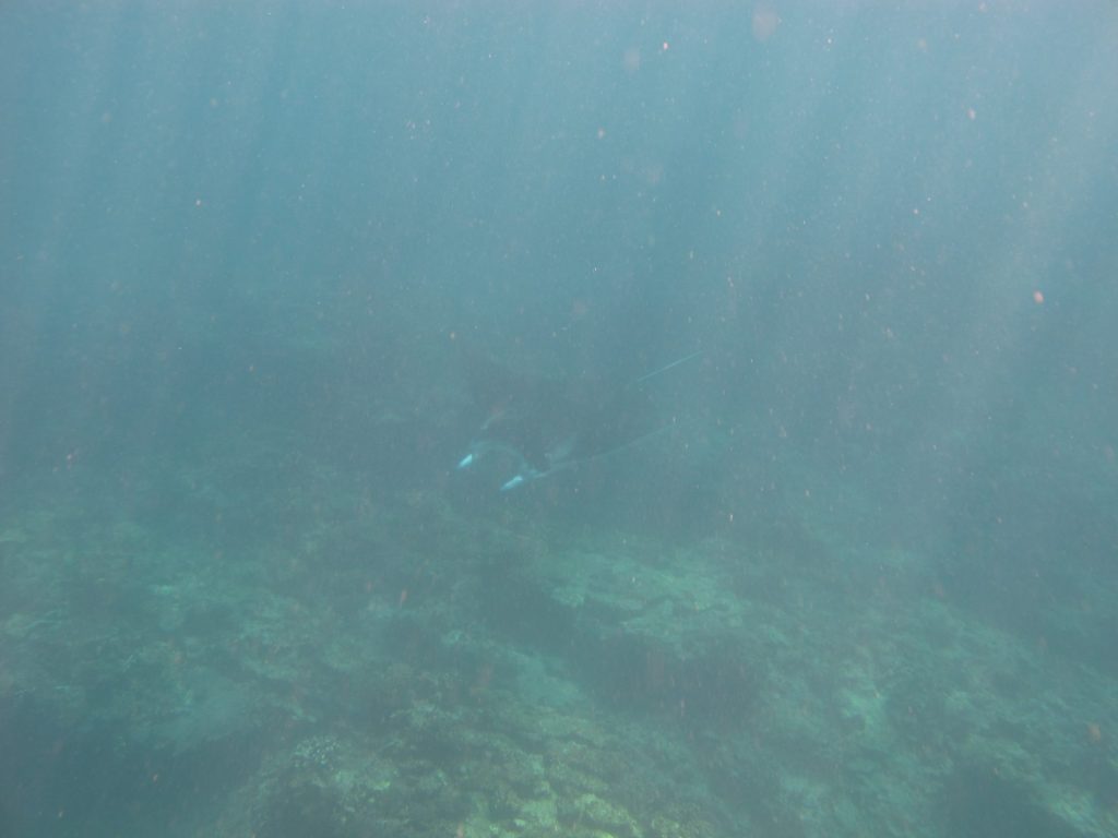 Op dat moment spot de piloot van het vliegtuigje echter ook een reuzenmanta. We varen er zo snel mogelijk op af en iedereen maakt zich klaar om terug in het water te glijden. Wetsuit aan, duikbril op, snorkel in de mond – GO GO GO GO!